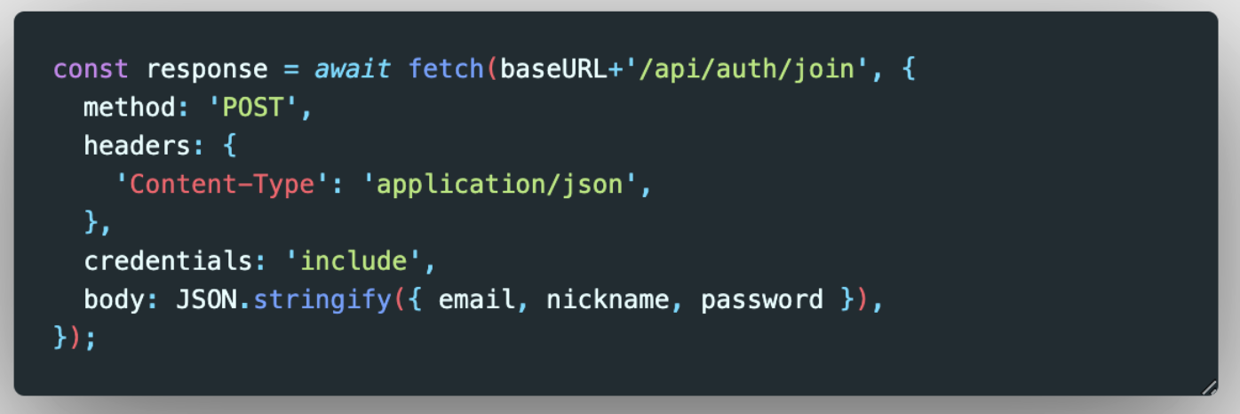 fetch를 이용해 브라우저에서 자격 증명이 포함된 인증서를 보낼 때 자격증명(credentials)에 대한 옵션을 추가해야 한다.
