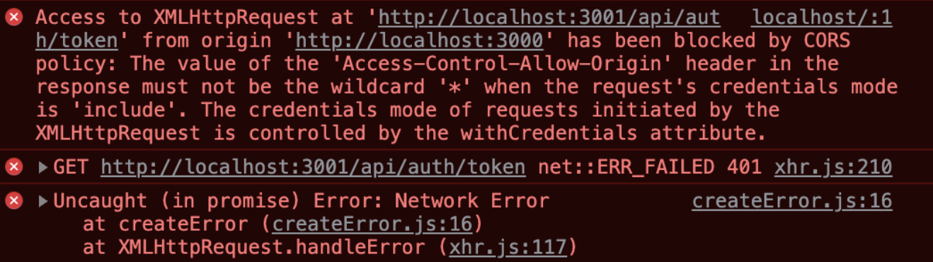 브라우저의 fetch API 사용시 'crudentials:include' 옵션을 부여하면 다음과 같은 에러를 볼 수 있다.