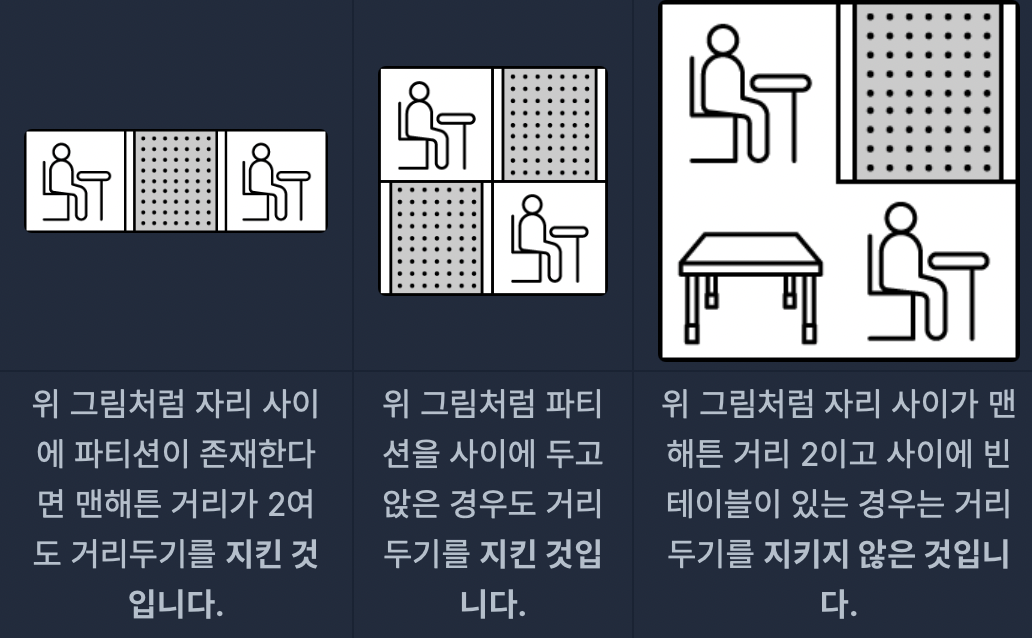 현재 대기실에 위치한 모든 응시자가 이 3가지 검증 과정을 통과할 때 이 대기실은 거리두기를 위반하지 않았다고 할 수 있다.