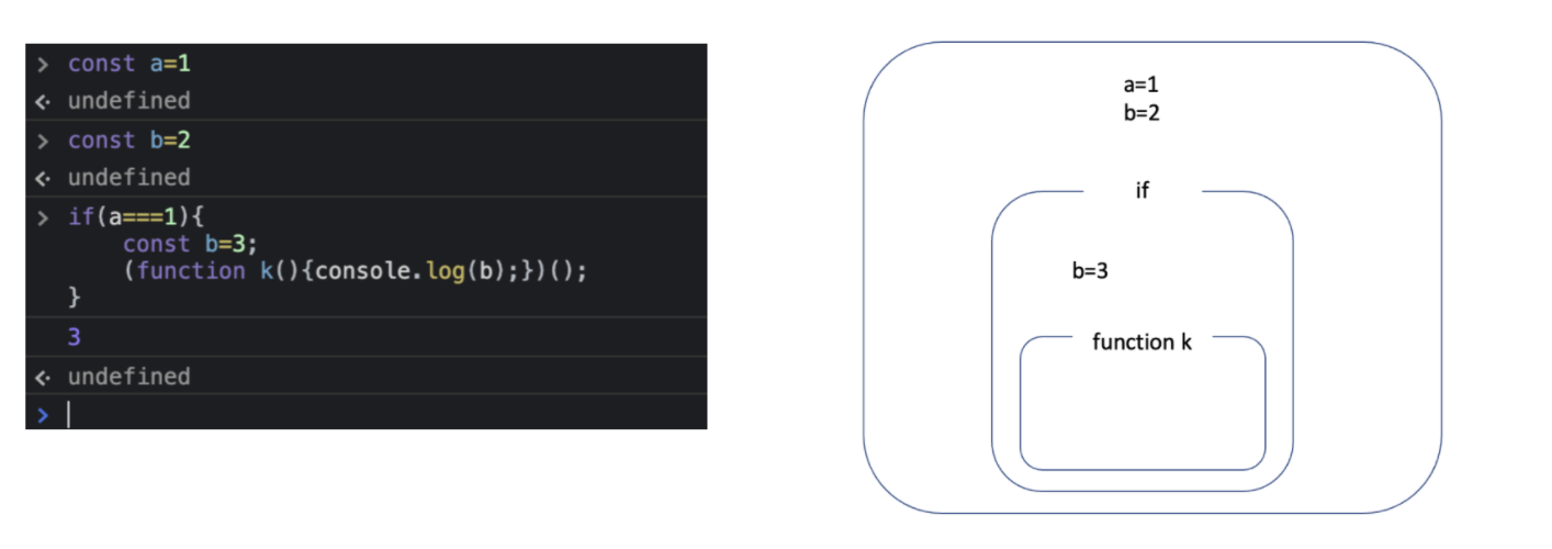 이 예시에서는, k 함수 스코프에서 b가 존재하지 않으므로 k 함수가 선언된 if 스코프로 올라간다.