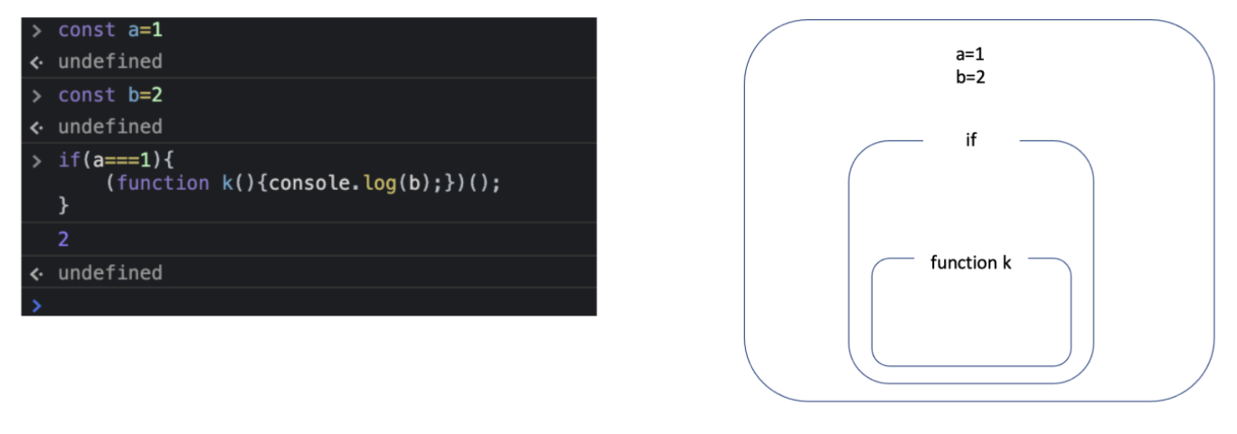 함수 k에서 b를 찾아서 출력해야 하는데, k 함수 스코프에서 b가 존재하지 않으므로 k 함수가 선언된 if 스코프로 올라간다.