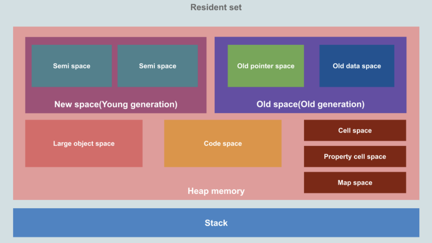 힙 메모리는 New, Old, Large Object, Code, [cell, property cell, Map] 영역으로 나뉘며, 차례대로 살펴보자.