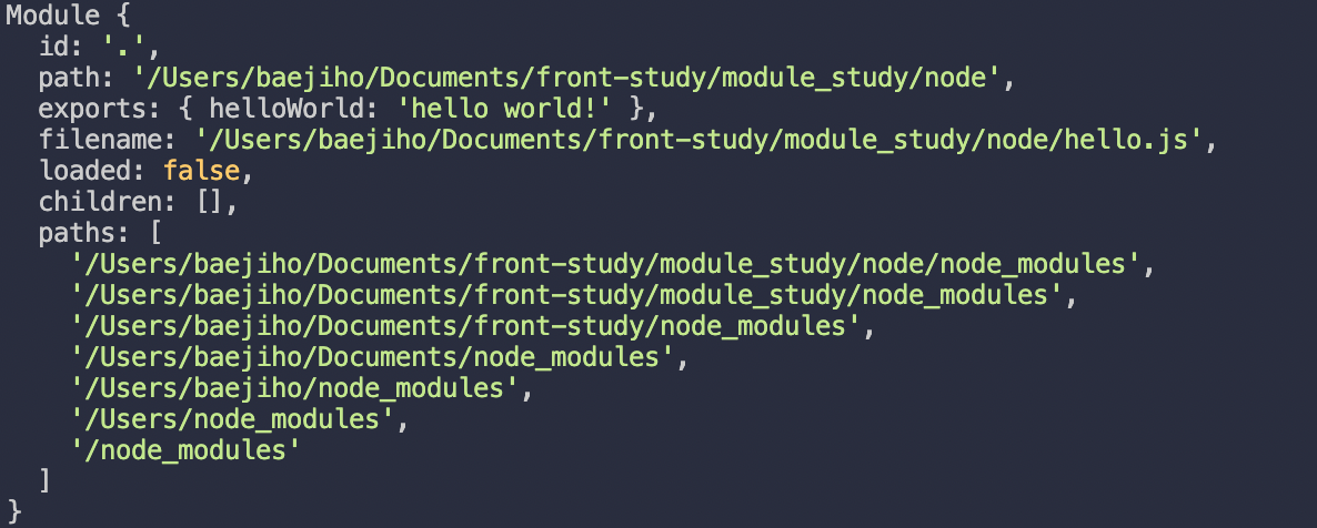 모듈 객체가 출력되는데, id, path, exports, filename 등등의 프로퍼티가 있으며 exports 프로퍼티에 주목해보자.