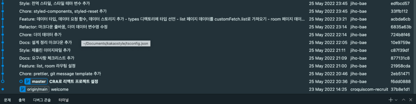 그래서 결국 main 브랜치에 "CRA로 리액트 프로젝트 설정" 이라는 새로운 커밋이 반영되었다.