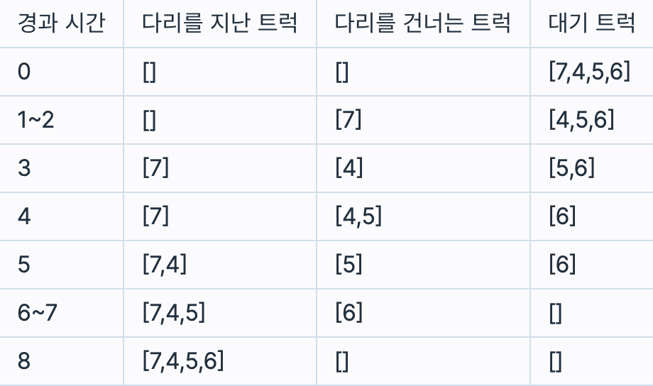 다리를 건너는 트럭 무게의 총합은 다리가 견딜 수 있는 무게를 넘을 수 없다.