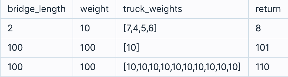 solution 함수의 매개변수로 다리 길이 bridge_length, 다리가 견딜 수 있는 무게 weight, 트럭별 무게 truck_weights가 주어집니다.