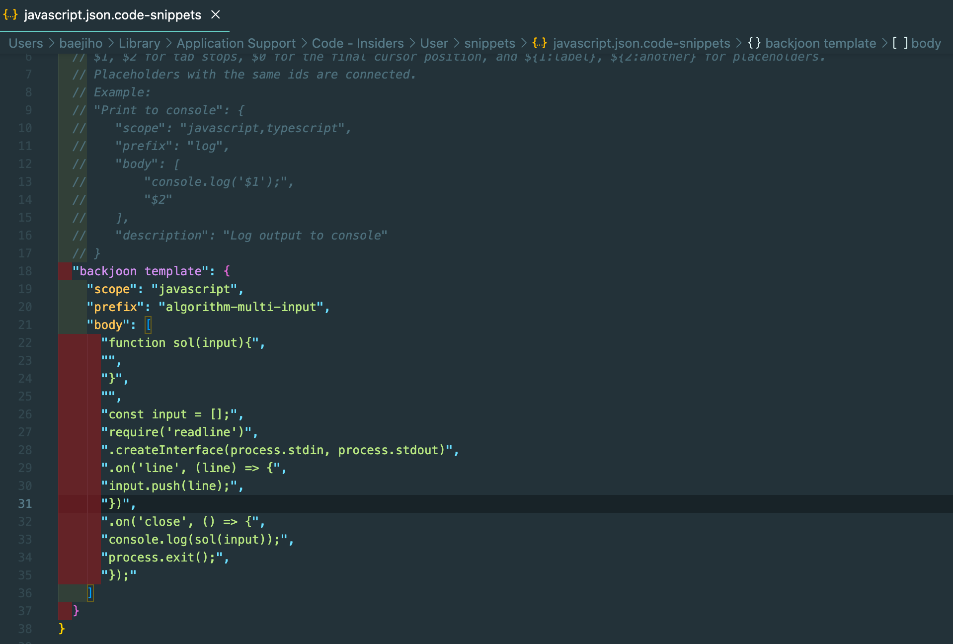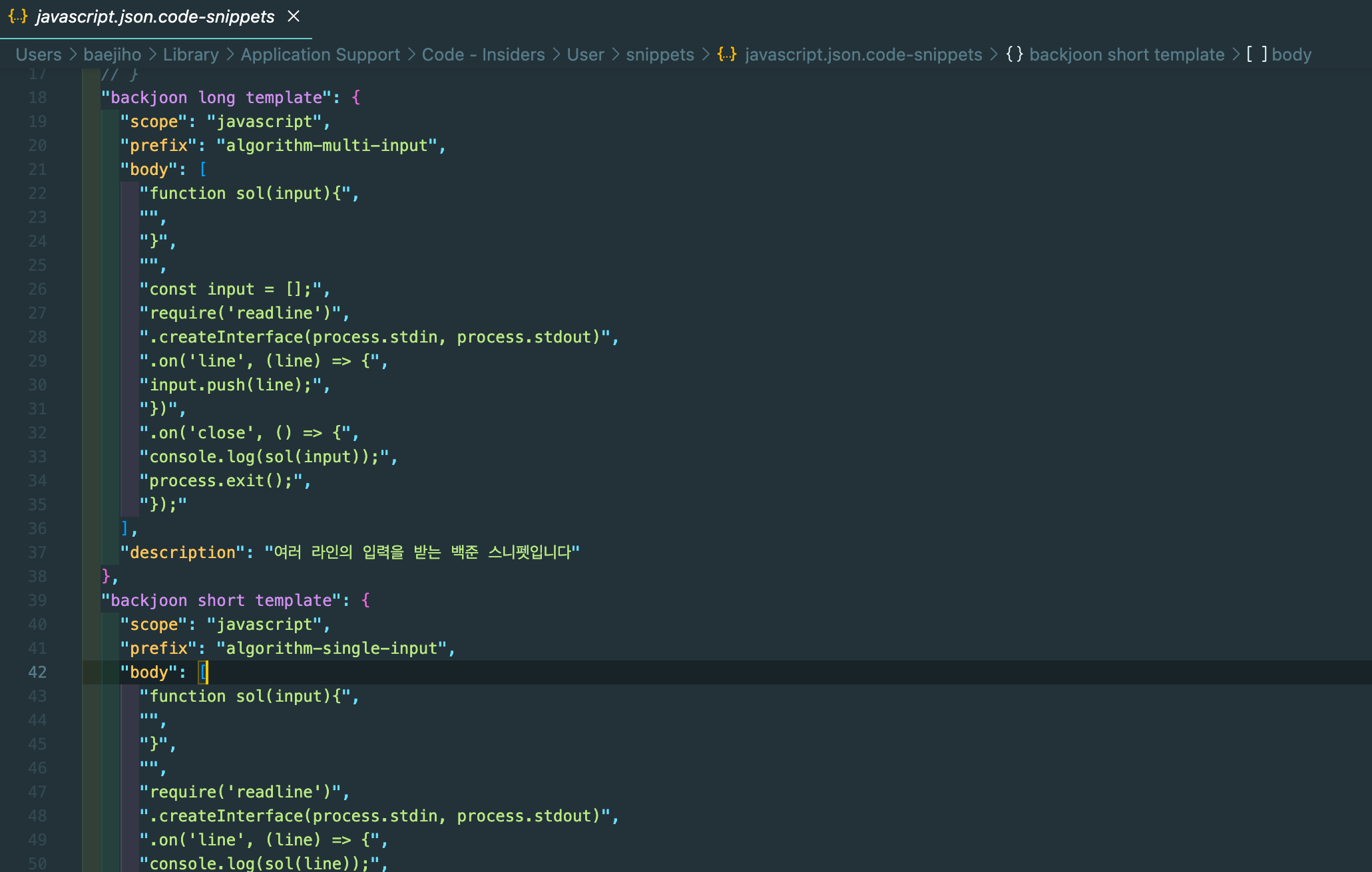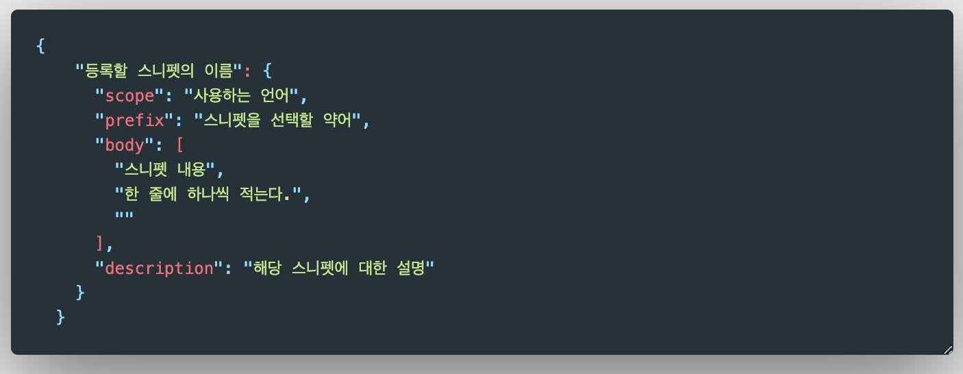 그래서 우선 양식에 맞춰서 등록할 스니펫을 가져왔다.