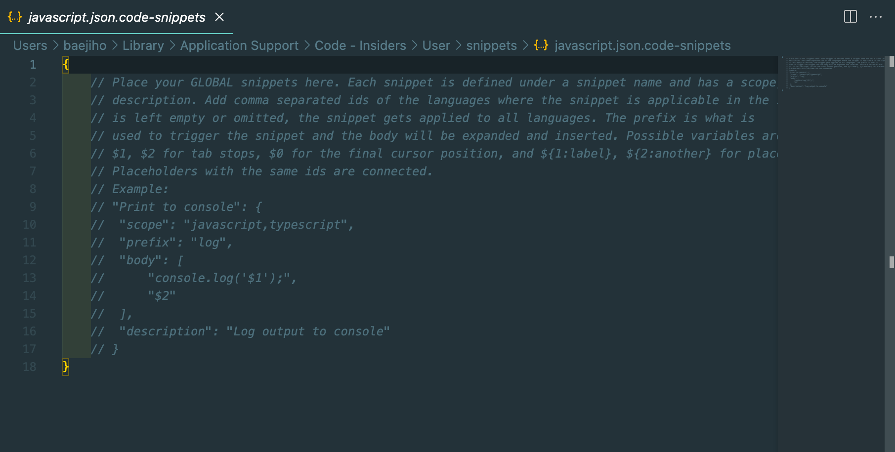 VSCode에서 [cmd + shift + p] 를 누르고, "snippets" 을 검색하자.