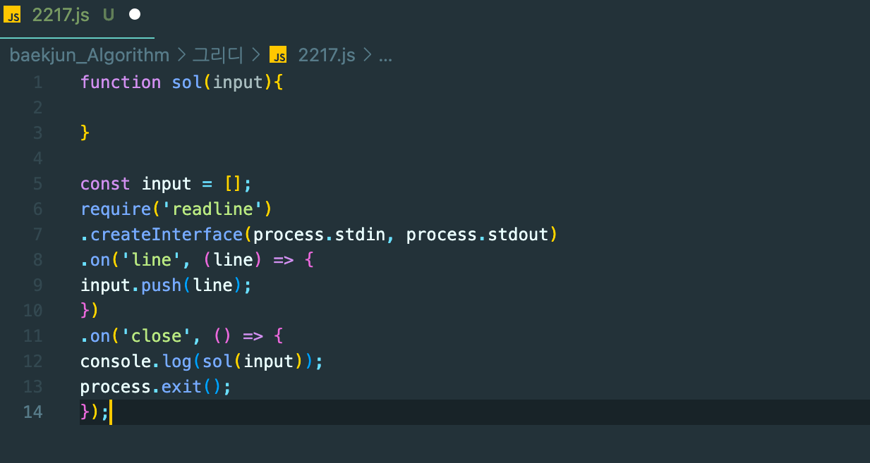대충 require('readline')~을 이용해서 "input 처리를 하는 코드"와 "문제풀이가 담긴 solution 함수 코드"를 함께 넣어서 제출한다.