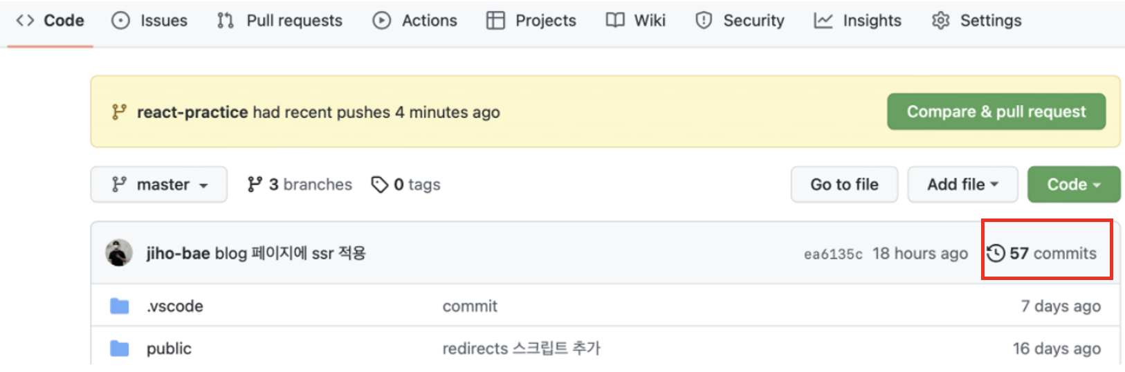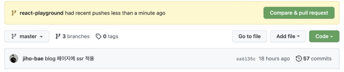 그럼 github 프로젝트에 노란색 문구가 뜨는데, 해당 브랜치로 이동해보면