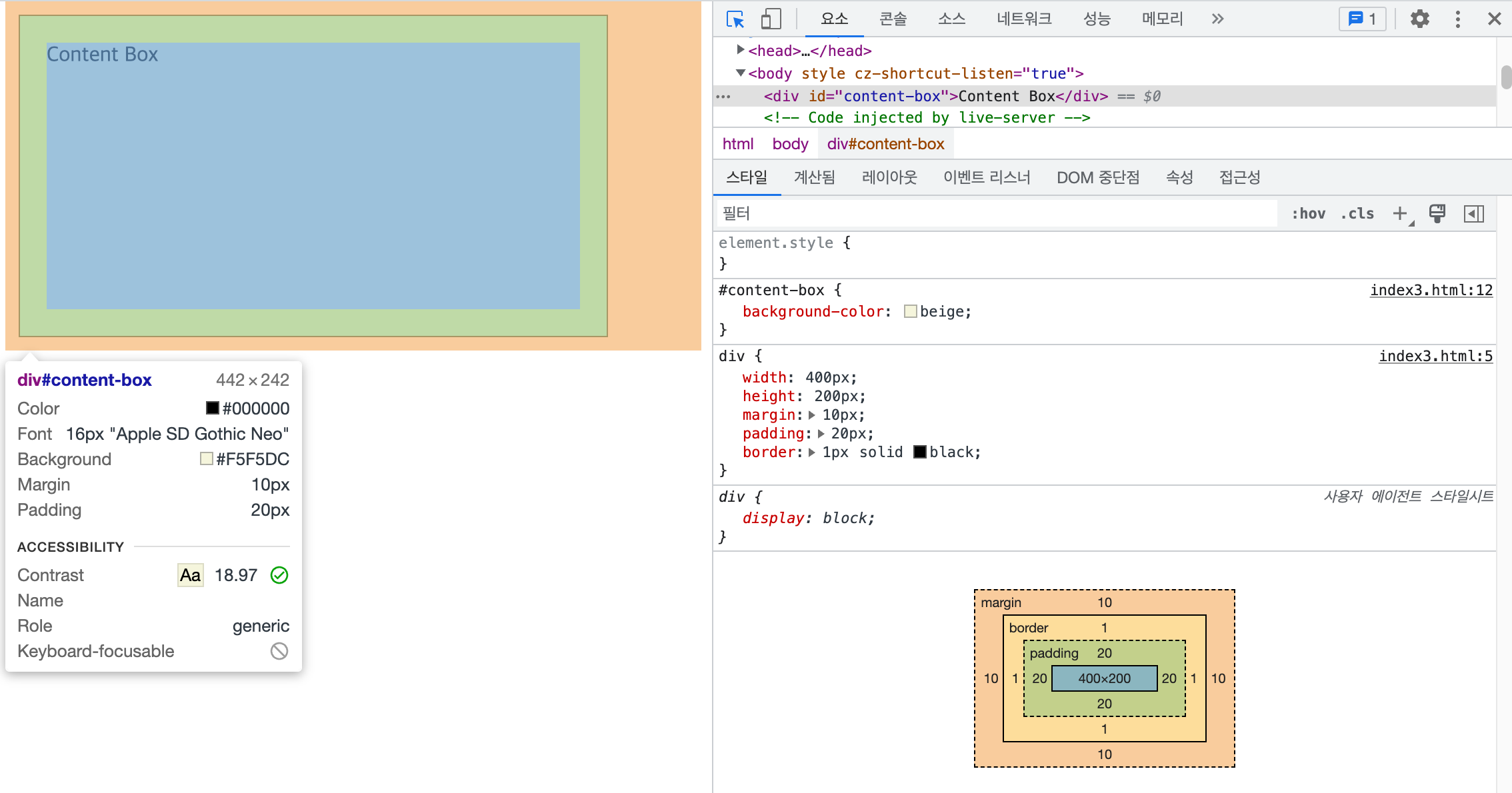 content-box 일 때는 지정한 width 값이 content box의 크기를 의미하게 된다.