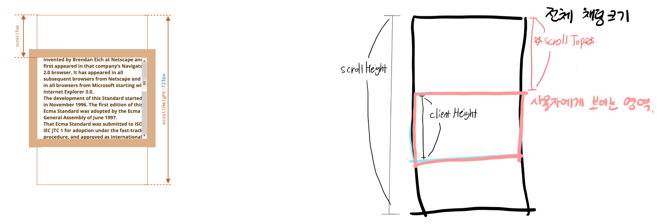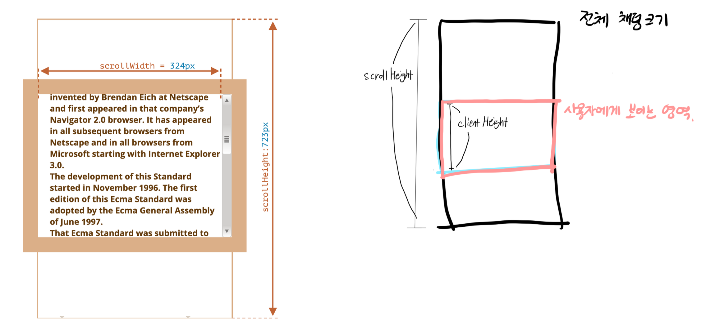 그러나, scrollHeight은 감춰진 영역을 포함한 요소의 전체 크기를 나타낸다.
