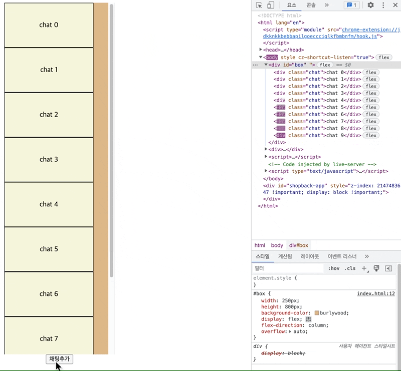 - css overflow 속성에 의해 chatBox 크기 이상으로 채팅들이 담겨 넘치면, 자동으로 스크롤이 생성된다.