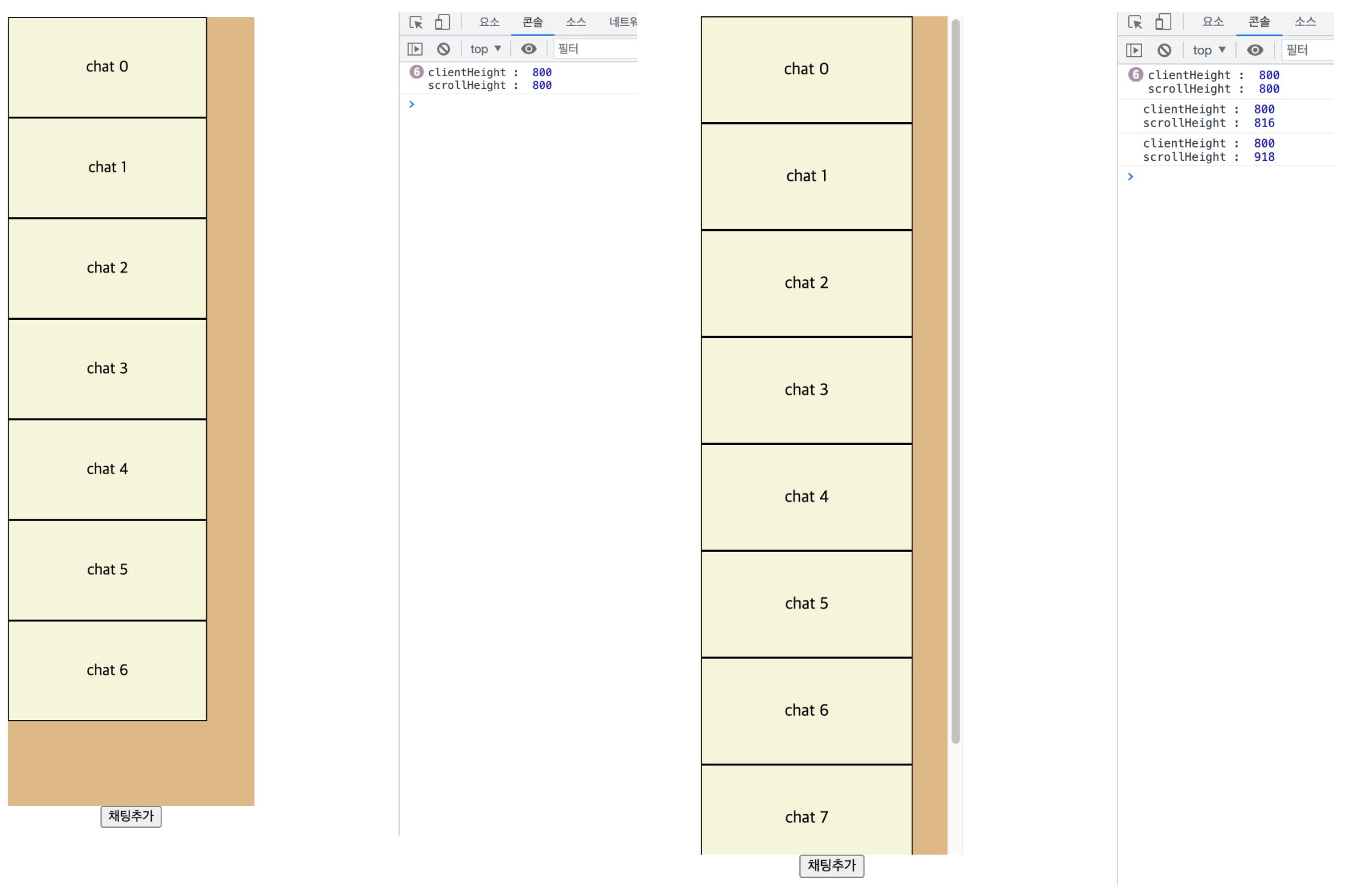 그래서 높이가 처음 설정한 800px를 넘어가면, scrollHeight 값은 증가하게 된다.