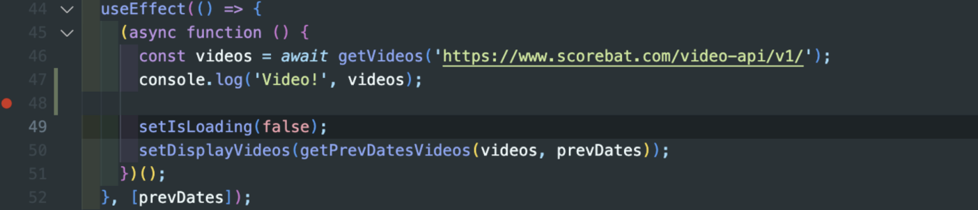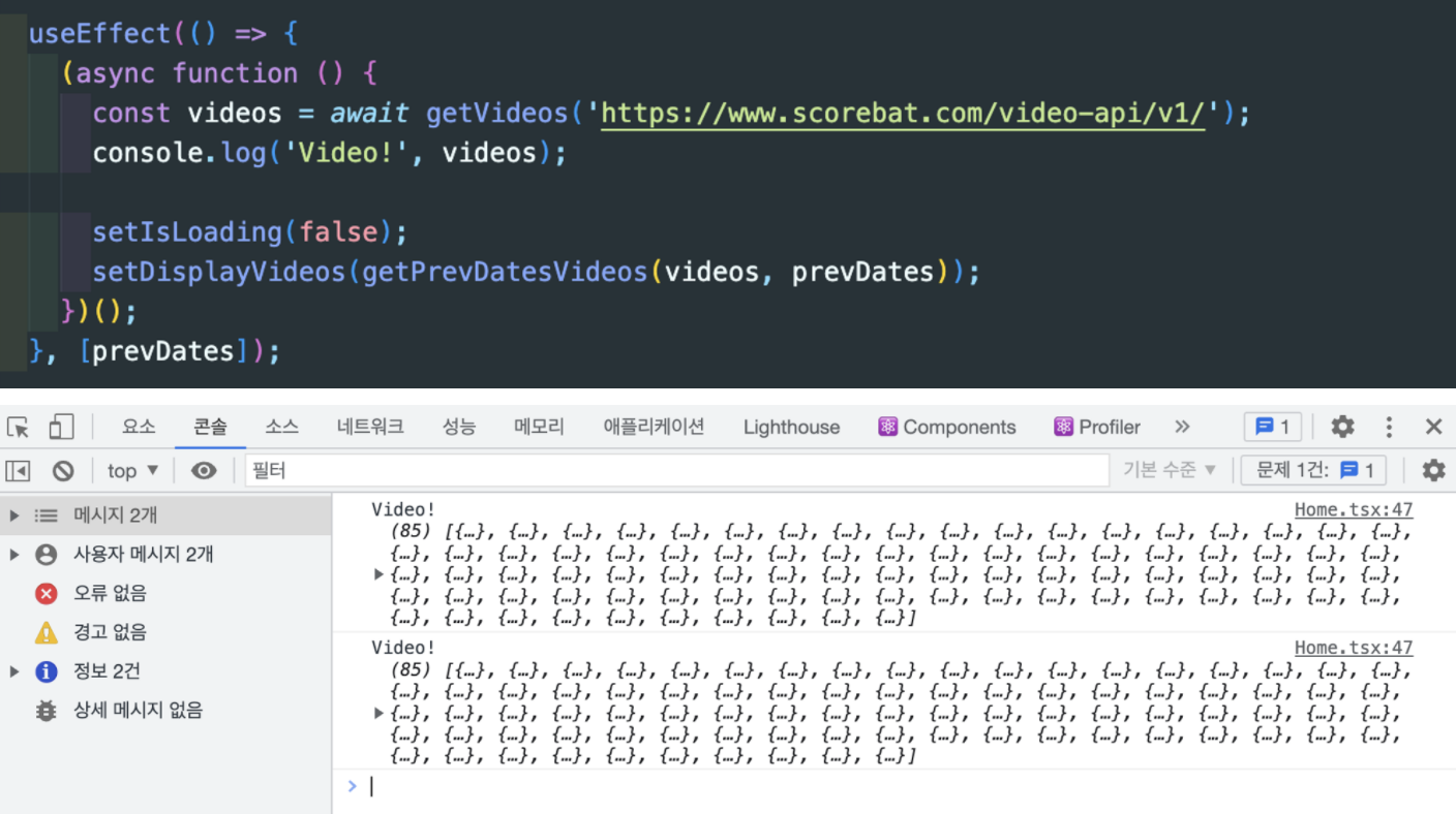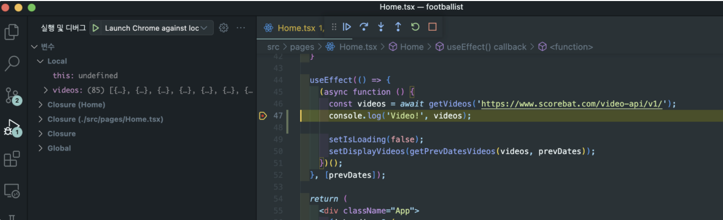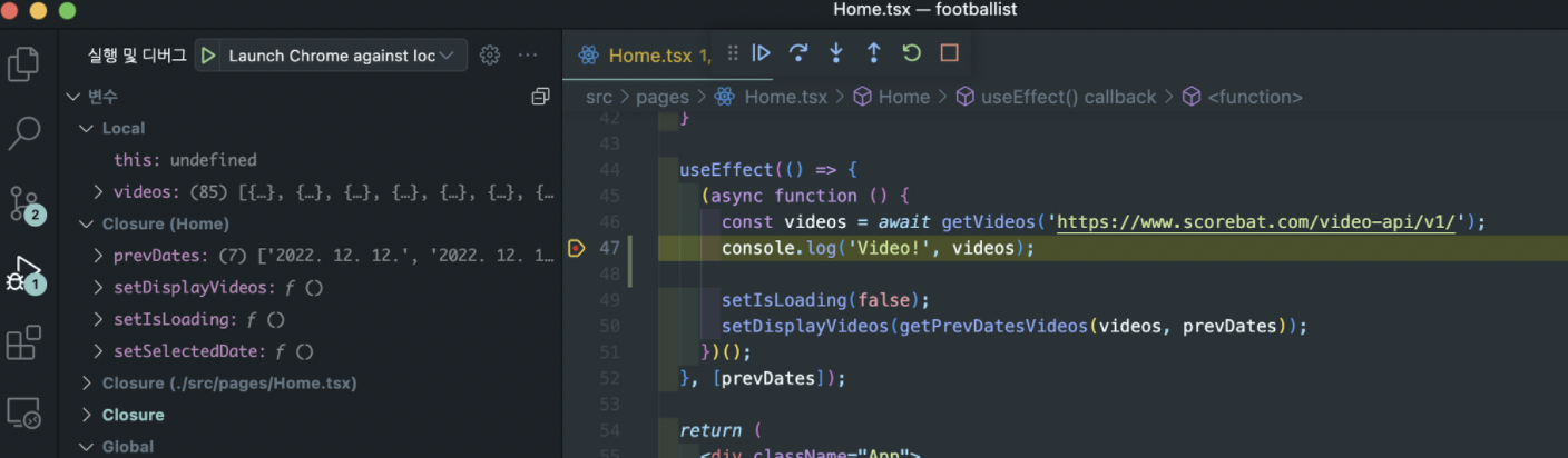 위에서 특이한 점은, 중단점이 걸린 위치가 useEffect + 내부의 즉시실행함수도 async 함수 내부라는 점이다.