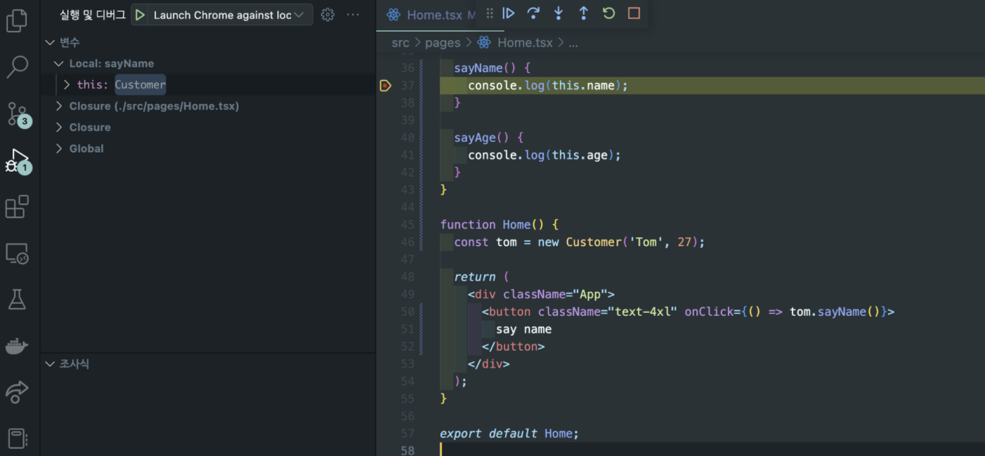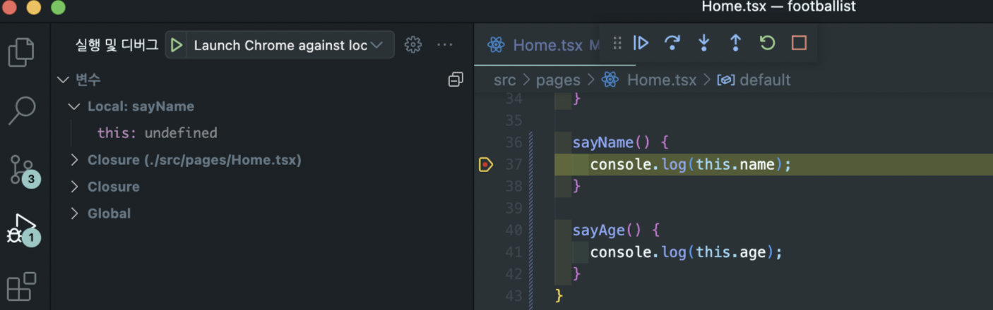 동일하게 이벤트리스너 sayName에 중단점을 걸어주면, this에 어떤 객체도 바인딩되어있지 않다.