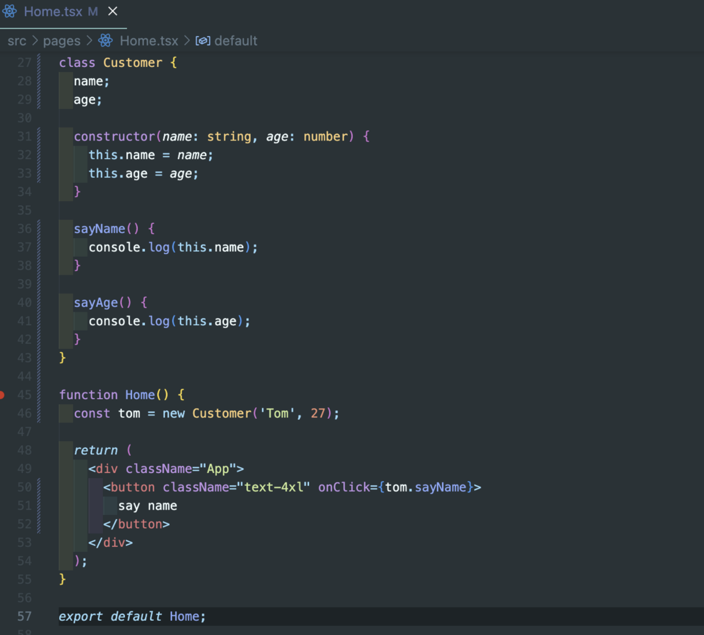 이제 의도한대로 say name 버튼 클릭시 console.log("Tom")이 출력된다.