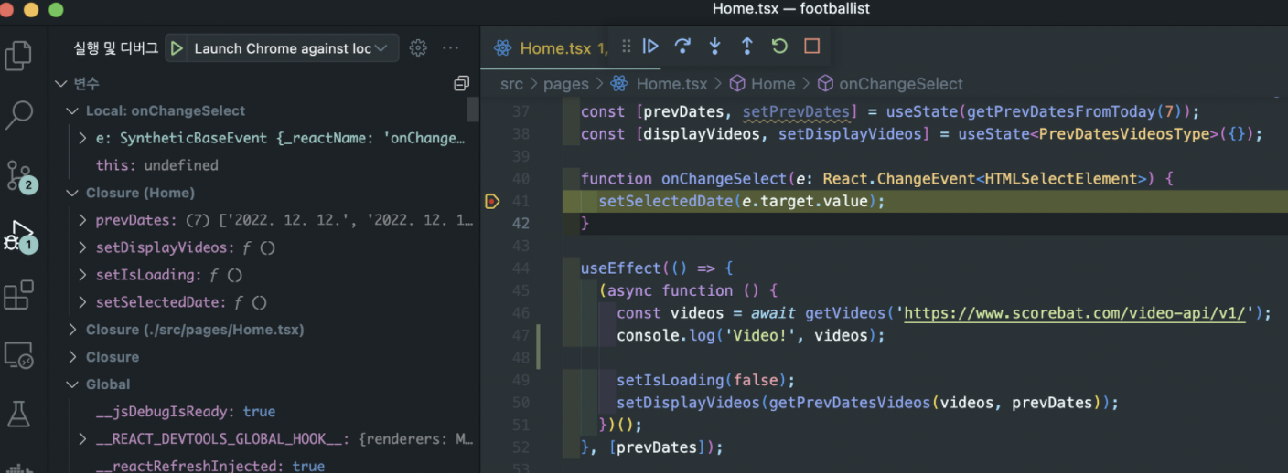 (이 때 npm start로 개발서버를 먼저 띄워둔 상태에서 디버그를 실행해준다. 구동중인 개발서버 기반으로 디버그가 실행된다.)
