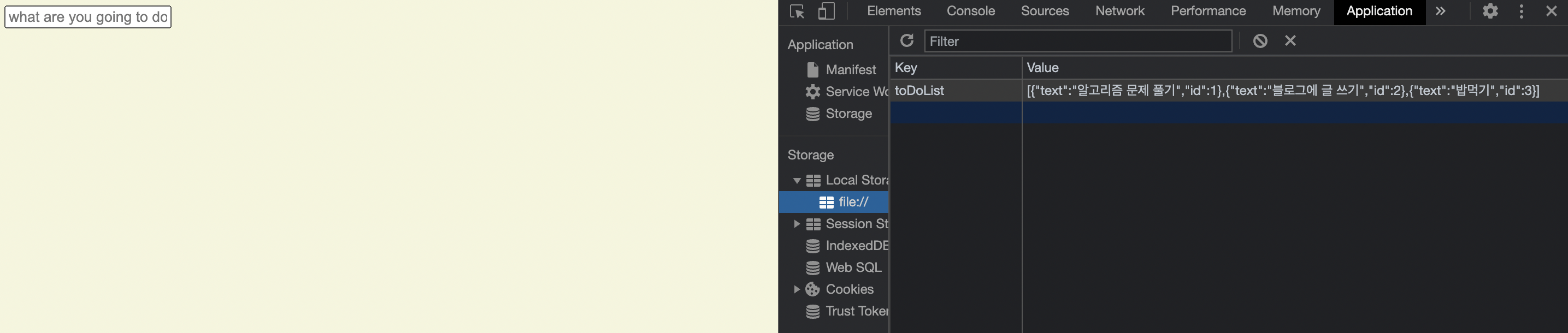 우리는 toDo를 화면에 보여줄 때 local storage에도 toDo를 저장하고,