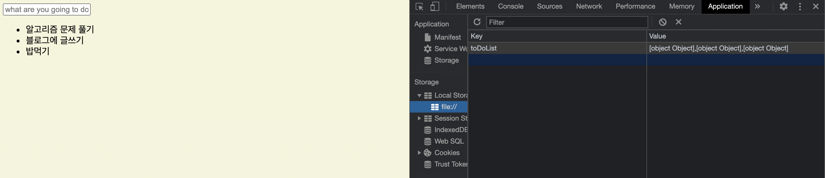 local storage에 String 값이 아닌 값을 저장하려고 할 때는 타입을 변환해줘야 한다.