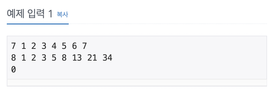 입력은 여러 개의 테스트 케이스로 이루어져 있다. 각 테스트 케이스는 한 줄로 이루어져 있다. 첫 번째 수는 k (6 < k < 13)이고, 다음 k개 수는 집합 S에 포함되는 수이다. S의 원소는 오름차순으로