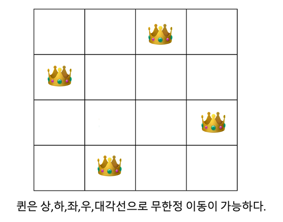 또한 위치시키고자 하는 열의 대각선에 퀸이 위치해도 불가능함을 고려하면 된다.