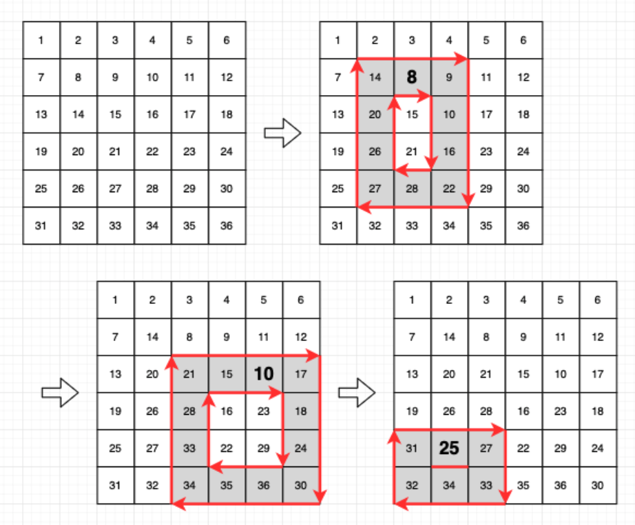 윗변의 우측 진행, 오른쪽 변의 아래로 진행, 아랫변의 왼쪽 진행, 왼쪽 변의 위로 진행을 순서대로 구현하면 된다.